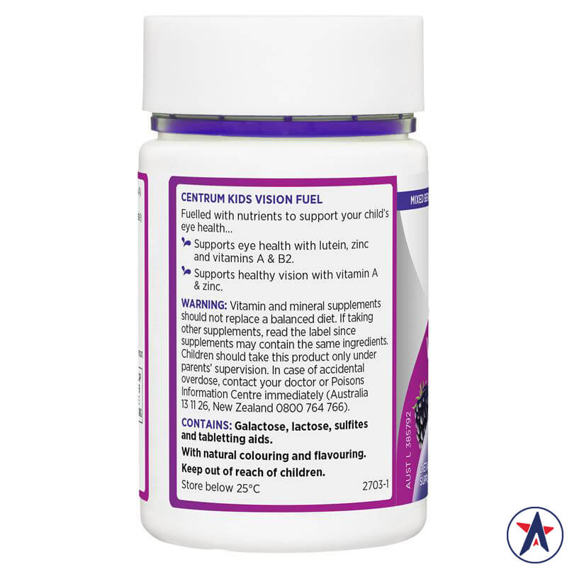 Centrum Kids Vision Fuel có hương vị quả berry hấp dẫn và chứa các chất dinh dưỡng quan trọng để hỗ trợ sức khỏe mắt của trẻ.