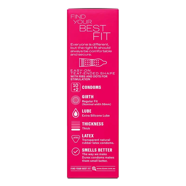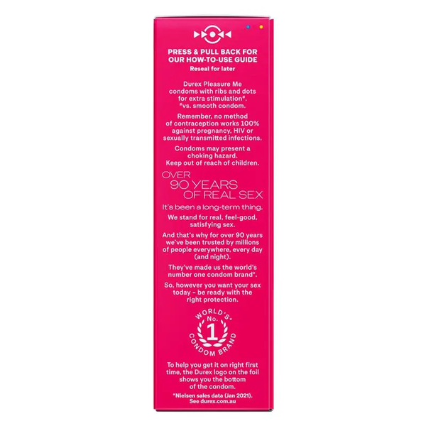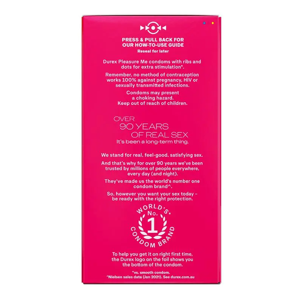 Bao cao su Durex Love Sex Pleasure Me Condoms được thiết kế có gân & chấm giúp gia tăng khoái cảm trong suốt "cuộc yêu" nhưng vẫn đảm bảo được độ an toàn tối đa.