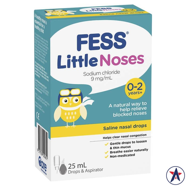 Fess Little Noses Saline Nose Drops + Aspirator, với dung tích 25ml, là một giải pháp tự nhiên giúp giảm nghẹt mũi ở trẻ sơ sinh và trẻ nhỏ. Sản phẩm này kết hợp giữa dung dịch nhỏ mũi và thiết bị hút mũi đặc biệt, giúp làm mềm và làm loãng chất nhầy, thông thoáng đường hô hấp cho bé.