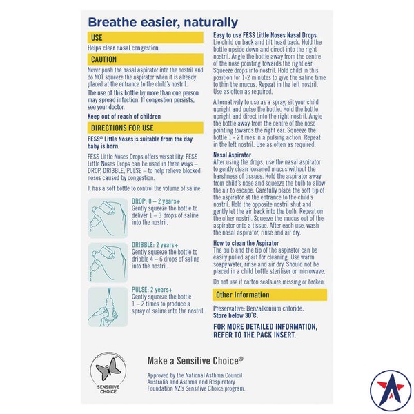 Fess Little Noses Saline Nose Drops + Aspirator là giải pháp lý tưởng và an toàn cho bé khi gặp vấn đề về nghẹt mũi. Sản phẩm này không chỉ giúp làm sạch và thông thoáng mũi cho bé mà còn góp phần vào việc chăm sóc sức khỏe tổng thể của trẻ. Chọn Fess Little Noses để giúp bé yêu của bạn hít thở dễ dàng hơn mỗi ngày!