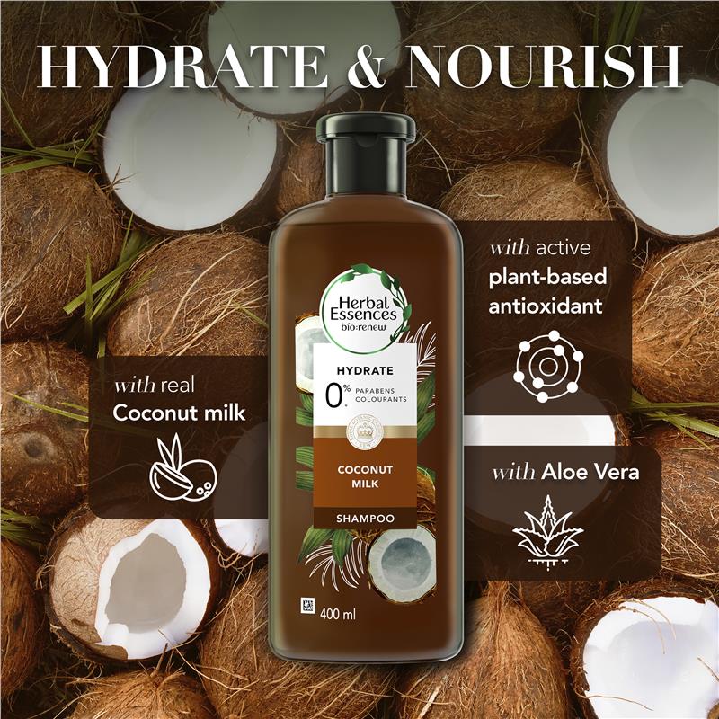 Dầu gội đầu Herbal Essences Hydrate Coconut Milk Shampoo 400ml sở hữu công thức chăm sóc tóc hoàn hảo, được chiết xuất từ nhiều loại thảo mộc thiên nhiên lành tính và giàu dưỡng chất sẽ giúp bạn giải quyết nhanh gọn lẹ mọi vấn đề mái tóc thường gặp phải. Cải thiện mái tóc hư tổn và mang lại một mái tóc chắc khỏe hơn.