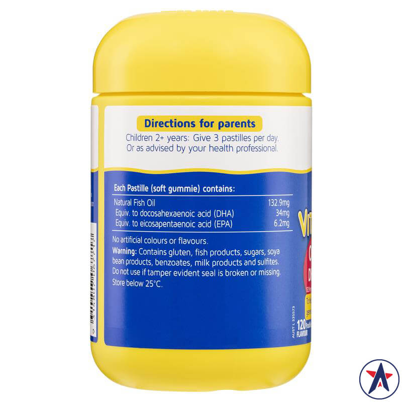 Chỉ cần sử dụng 1 viên mỗi ngày, bé cũng có thể hấp thụ tối đa những dưỡng chất cần thiết để phát triển một cách toàn diện. Thành phần Cụ thể như sau: Dầu cá (Thành phần chính là omega 3 và DHA), Vitamin E tự nhiên và các thành phần khác là Glucose, Gelatin, Hương vị tự nhiên, Nước và Axit thực phẩm.