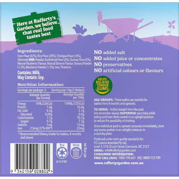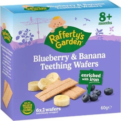 Bánh ăn dặm Rafferty’s Garden Blueberry & Banana được làm từ bốn loại ngũ cốc (ngô, gạo, đậu gà, kiều mạch, và quinoa) và enriched với sắt, mang lại hương vị thơm ngon cùng kết cấu giòn tan. Sản phẩm giúp bé làm dịu nướu đau khi mọc răng và dễ dàng cầm nắm, phù hợp để mang theo trong túi đồ khi đi ra ngoài.
