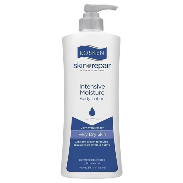 Kem dưỡng ẩm toàn thân Rosken Skin Repair Intensive Moisture Body Lotion là sản phẩm dưỡng da chuyên biệt từ thương hiệu Rosken (Úc), được thiết kế dành riêng cho da khô đến rất khô, da thiếu nước, da bong tróc hoặc da cần phục hồi mạnh mẽ. Với công thức moisture boosting giàu dưỡng chất, kem giúp cung cấp độ ẩm tức thì, khóa ẩm lâu dài ngay từ lần sử dụng đầu tiên và tăng gấp đôi mức độ ẩm da chỉ sau 4 ngày sử dụng đều đặn – giải pháp lý tưởng cho da khô nứt nẻ, đặc biệt vào mùa hanh khô hoặc sau khi tắm.