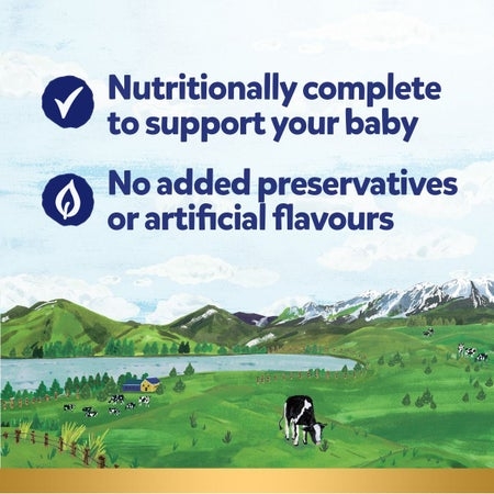 Milk solids, vegetable oils (contains Emulsifier (Soy Lecithin), Antioxidant (Ascorbyl Palmitate)), Maltodextrin, short chain galacto-oligosaccharides (contains milk), dried omega LCPUFAs. Calcium, Phosphorus, Magnesium, Iron, Zinc, Iodine. Vitamins (A1, B1, B2, B3, B6, B12, C, D3, E), Folic Acid. Contains: cows' milk, fish and soy.