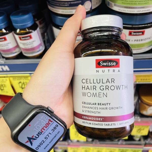 Viên uống mọc tóc, giảm rụng cho nữ Swisse Nutra Cellular Hair Growth Women là thực phẩm bổ sung tóc cao cấp hoạt động từ cấp độ tế bào, giúp kích thích mọc tóc tự nhiên, tăng độ dày, giảm gãy rụng và cải thiện sức khỏe tóc rõ rệt chỉ sau 12 tuần*. Công thức kết hợp Ceramosides® (chiết xuất phytoceramides từ lúa mì, được nghiên cứu lâm sàng năm 2024) cùng biotin, kẽm, đồng, sắt, selen và methionine – giúp nuôi dưỡng nang tóc từ bên trong, hỗ trợ chức năng tuyến giáp và bảo vệ tế bào khỏi gốc tự do.