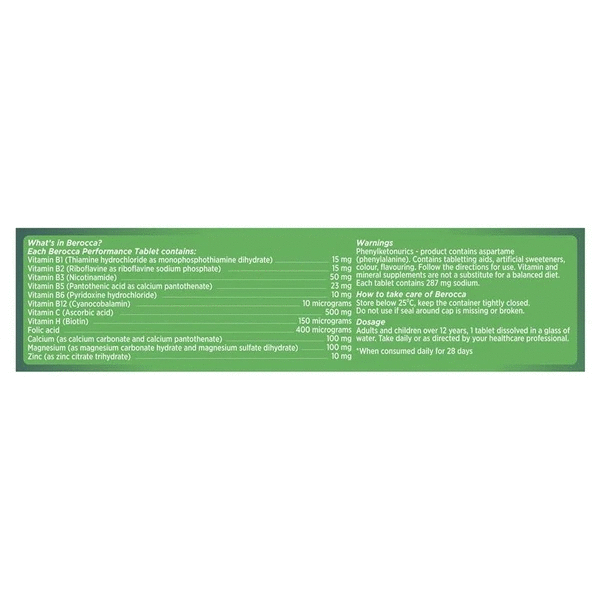 - Mỗi Viên Sủi Berocca Performance chứa: Vitamin B3 50mg, Vitamin B2 15mg, Vitamin B1 15mg, Vitamin B5 23mg, Vitamin B12 0,01mg, Vitamin B6 10mg, Vitamin C 500mg, Vitamin H 0,15mg, Calcium 100mg, Magnesium 100mg, Zinc 10mg, Folic acid 0,4mg, Natri 247mg.