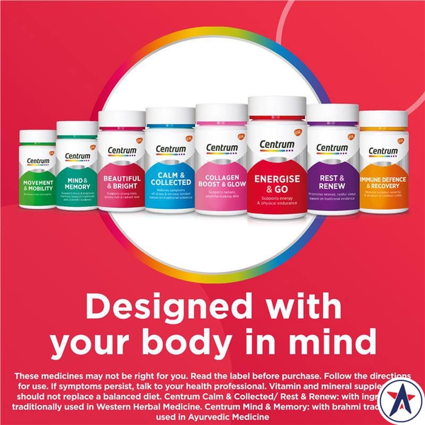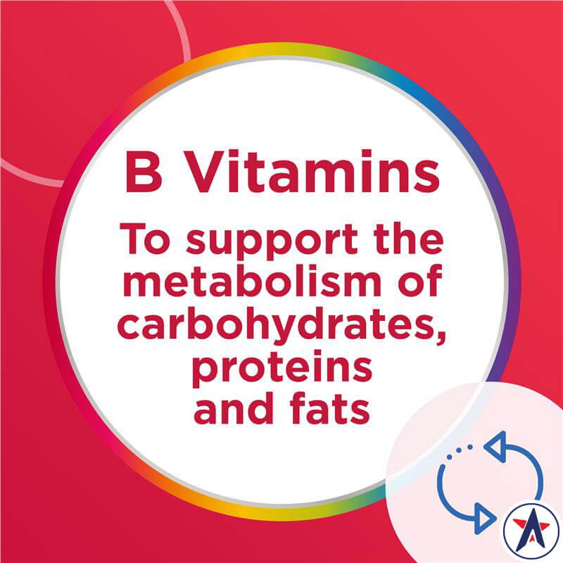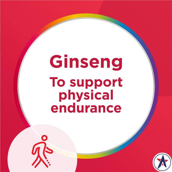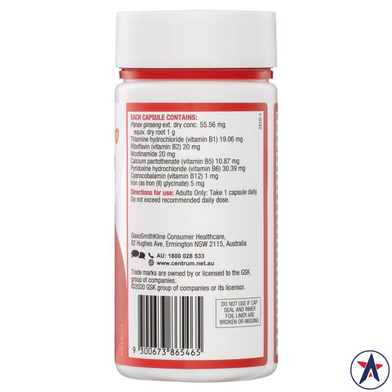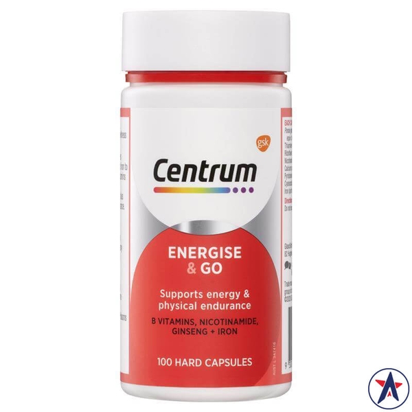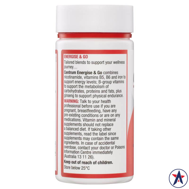 Centrum Energise & Go kết hợp nicotinamide, vitamin B5, B6 và sắt để hỗ trợ cung cấp năng lượng; vitamin nhóm B giúp hỗ trợ chuyển hóa carbohydrates, protein và chất béo, cùng với ginseng hỗ trợ sức bền vật lý.