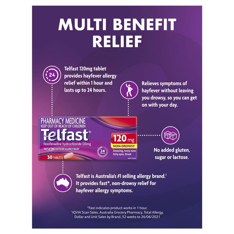 Viên uống giảm dị ứng Telfast Hayfever Allergy Relief 120mg Non-Drowsy cung cấp giải pháp nhanh chóng và không gây buồn ngủ trong việc giảm các triệu chứng dị ứng do sốt cỏ khô. Sản phẩm này phù hợp với những người trưởng thành và trẻ em trên 12 tuổi, giúp kiểm soát và làm giảm nhanh chóng các triệu chứng khó chịu do dị ứng như hắt hơi, chảy nước mũi, ngứa mắt và ngứa họng.